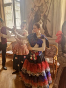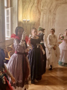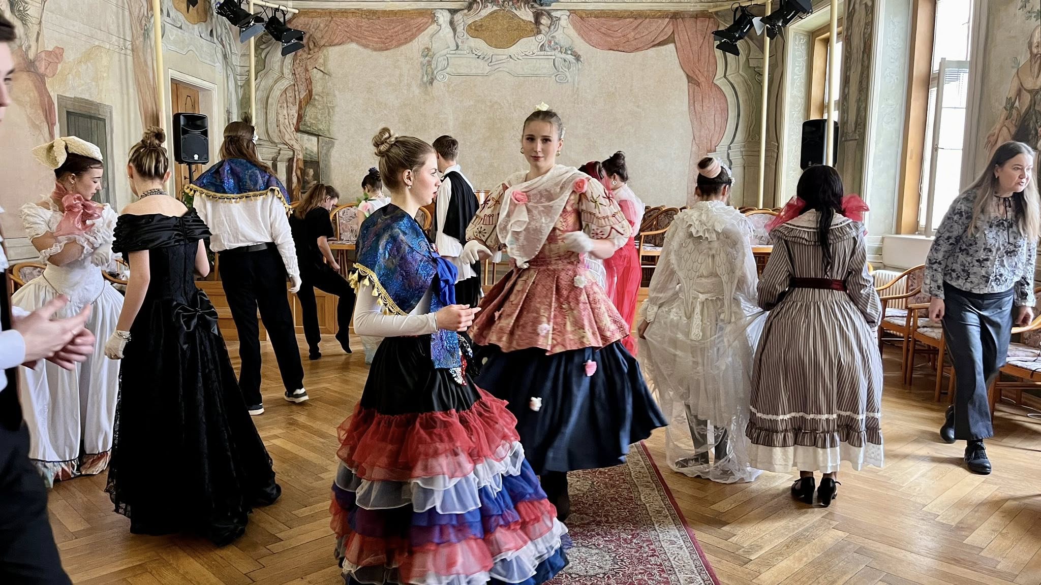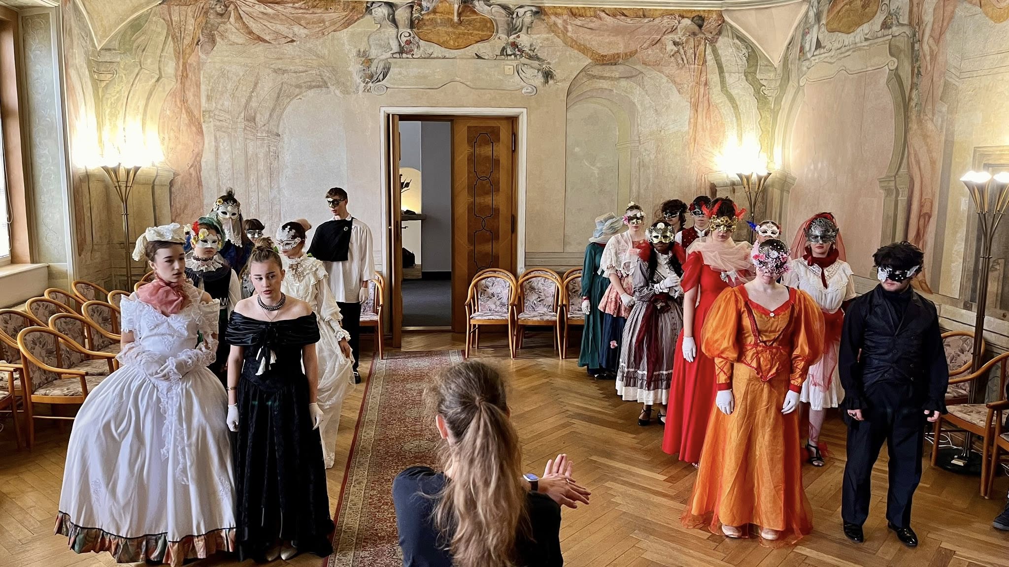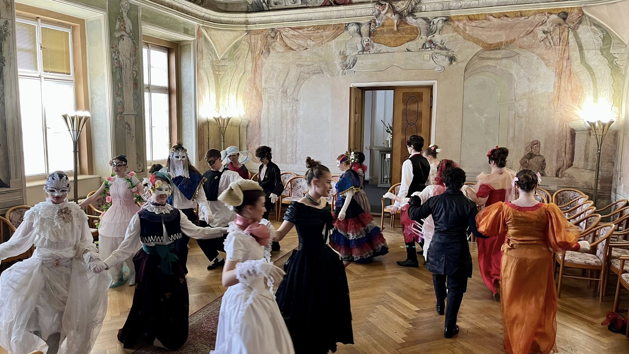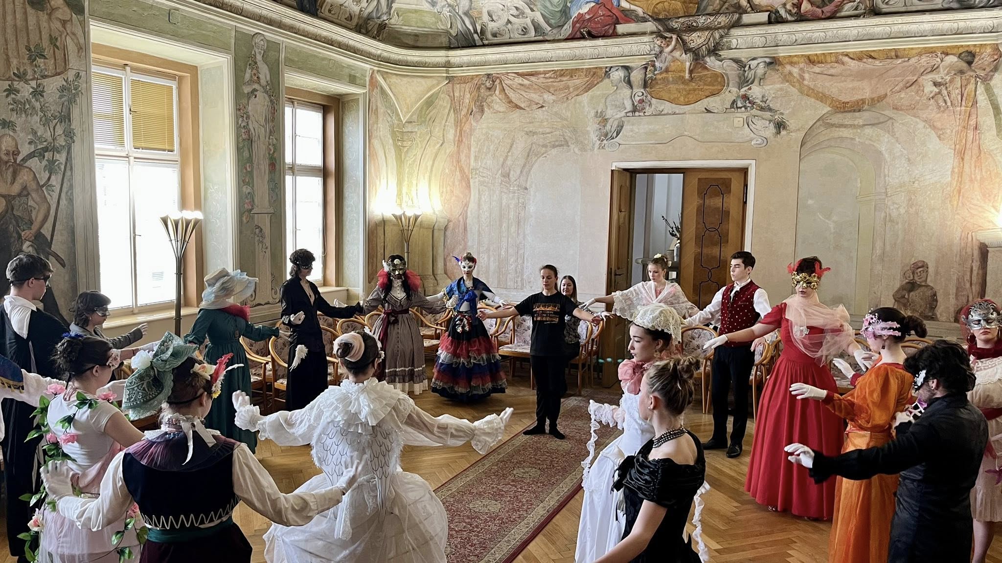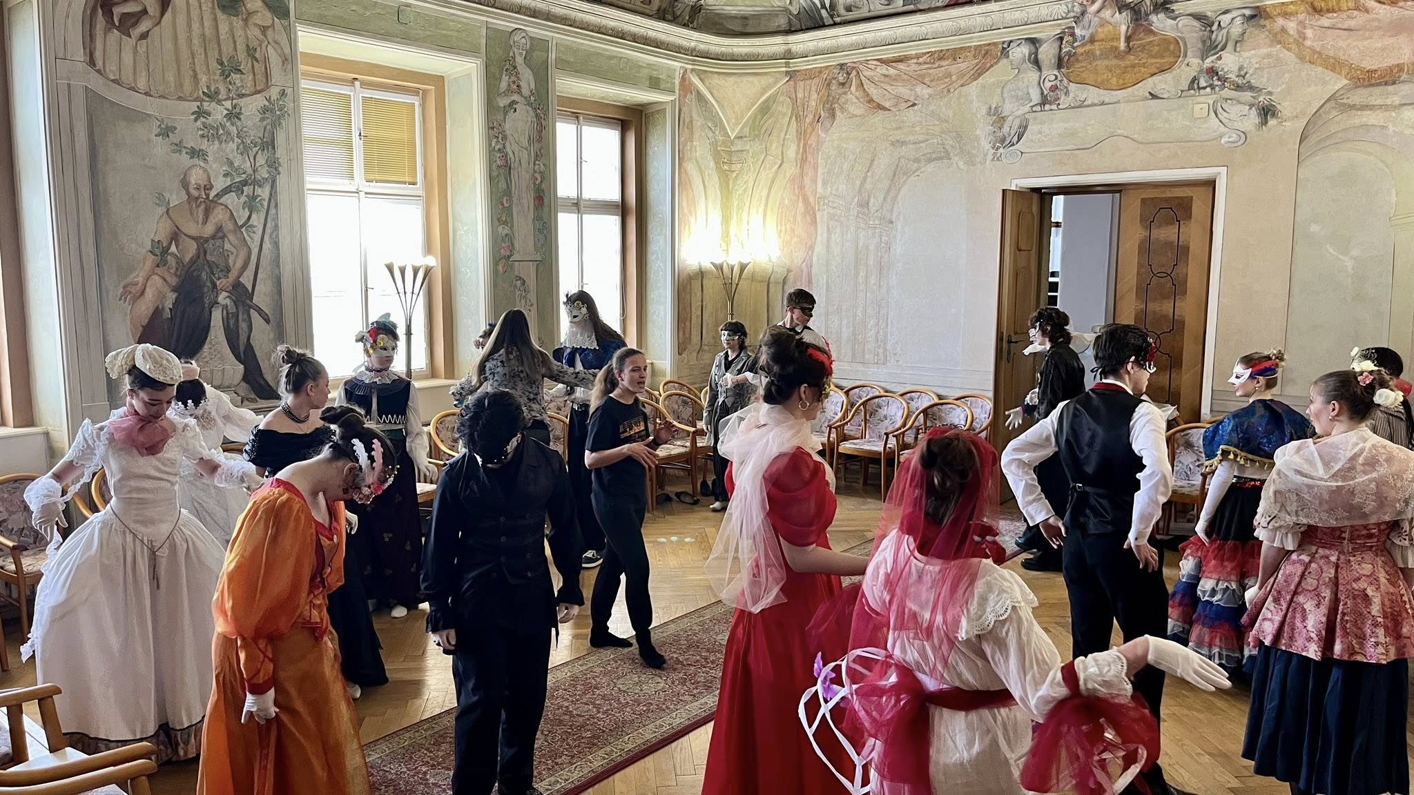 Na teoretickou část navázala praktická část v koncertním sále, kde si studenti vyzkoušeli dobové tance – konkrétně kurantu a bourrée – pod vedením lektorky Veroniky Rehbergerové.