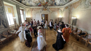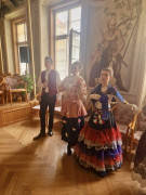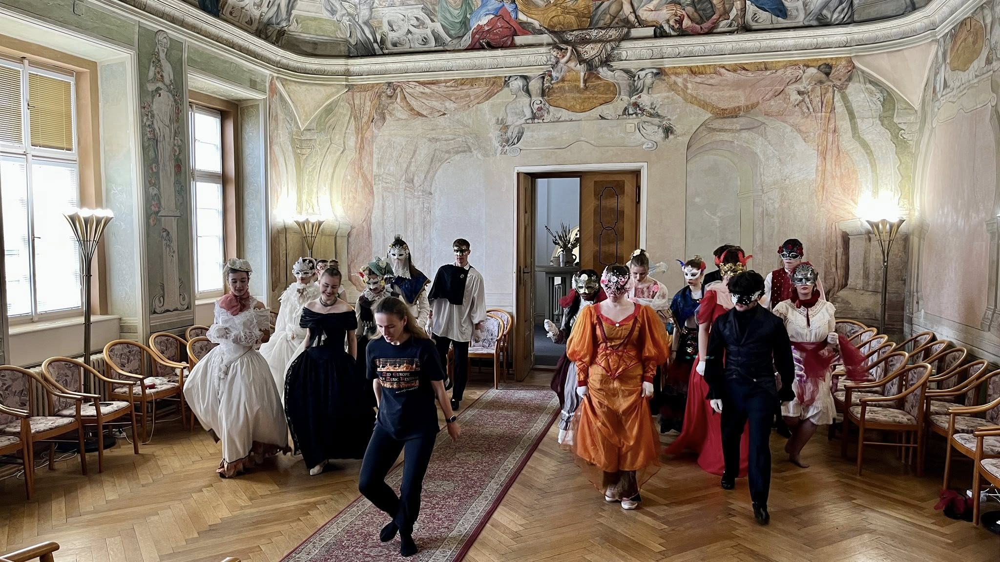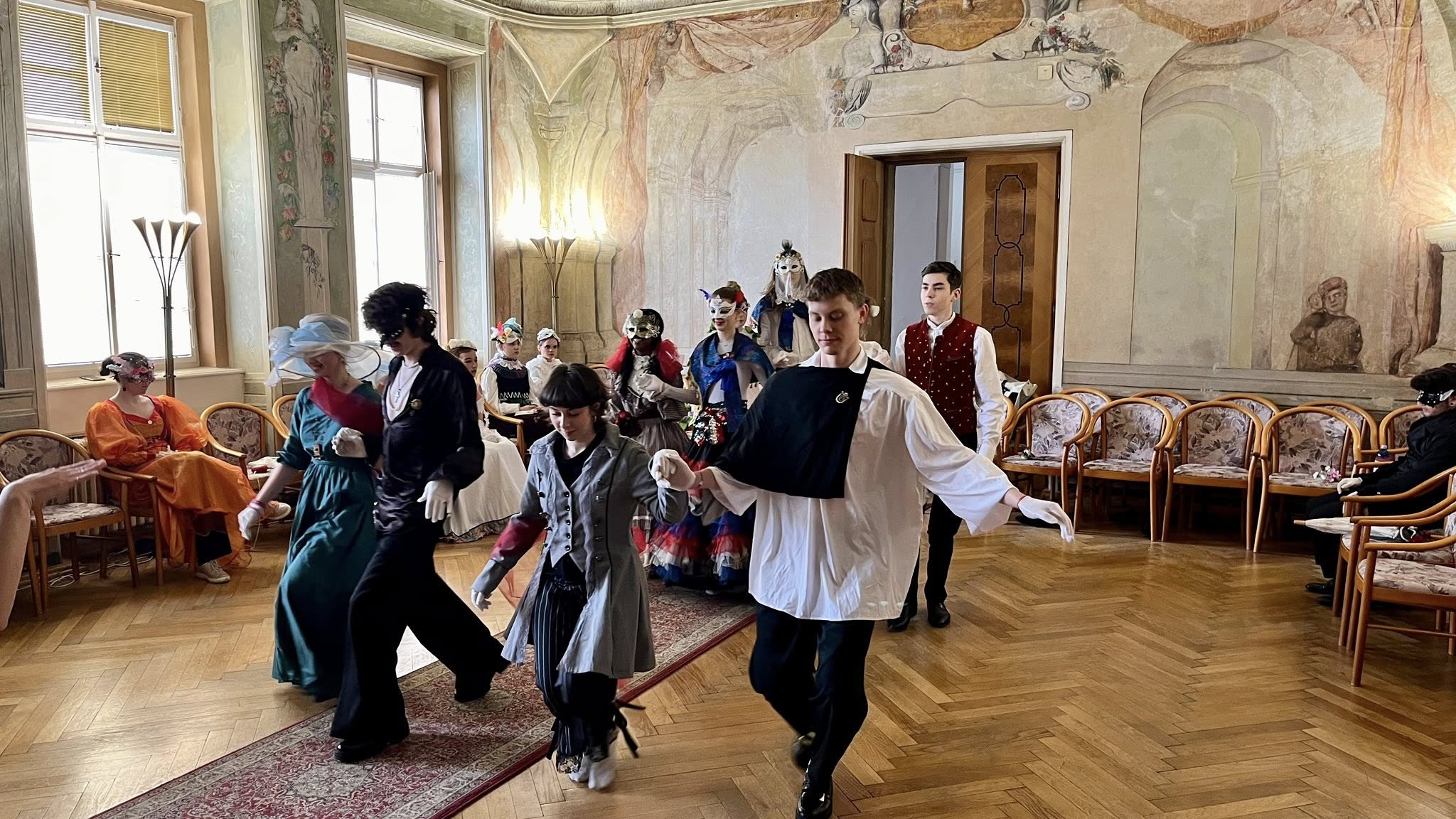 Na teoretickou část navázala praktická část v koncertním sále, kde si studenti vyzkoušeli dobové tance – konkrétně kurantu a bourrée – pod vedením lektorky Veroniky Rehbergerové.