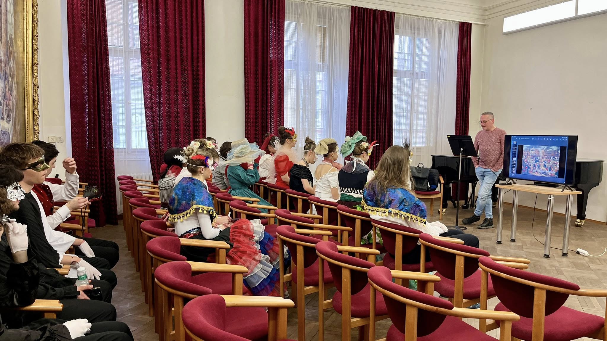 Tematické setkání věnované Benátskému karnevalu, určené studentům pěveckého oddělení, vedla pedagožka Pavla Zumrová, DiS., a nabídlo jedinečné propojení jazykové výuky s kulturně-historickým kontextem.